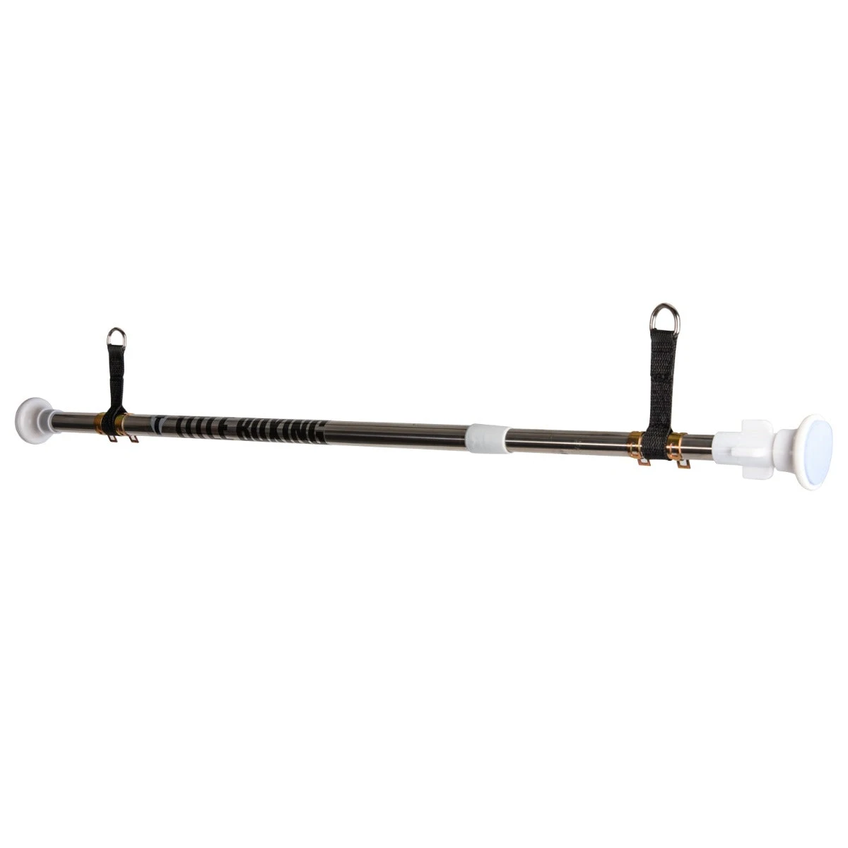 A simple, superb, and dependable option for hanging double end bags, spider bags, and other light training bags from any doorway. Simply fit to doorway width, twist the locking spin knob and the hanger is secure and ready for action. Durable rubber grip end caps keep the hanger secure and slip-free during intense action. The Adjustable Doorway Hanger comes with two seatbelt nylon hanging straps with steel O-rings for attaching bags or straps, if needed. The Adjustable Doorway Hanger expands from 29” to 46.75” in length to fit almost any doorway width. Also works great to secure to the bottom of the doorway for use as a double end bag or light bag anchor. Use one Adjustable Doorway Hanger on top of the doorway for hanging and one on the bottom for securing, making your doorway a completely portable workout station . . . in just seconds. Not manufactured for supporting body weight, pull-ups or heavy bags.